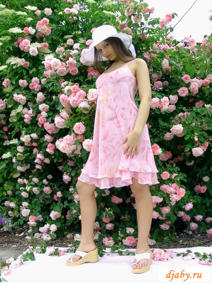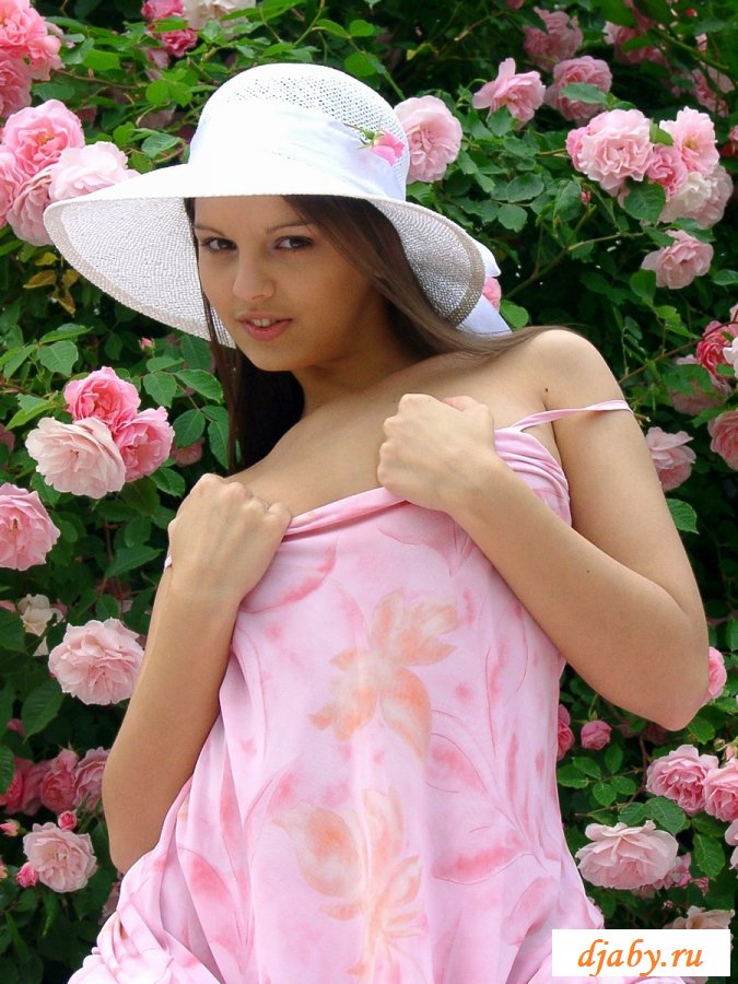 Нежная девушка в мягком тонком платье розового цвета и в розовенькой шляпке, позирует около куста бело-розовых роз. Девушка показывает свою красивые, белые, сладенькие сисечки, задирает платье и оголяет роскошную попку, которую ласкает своими пальчиками.