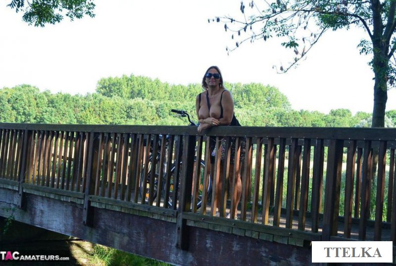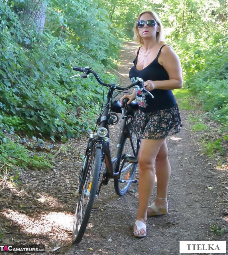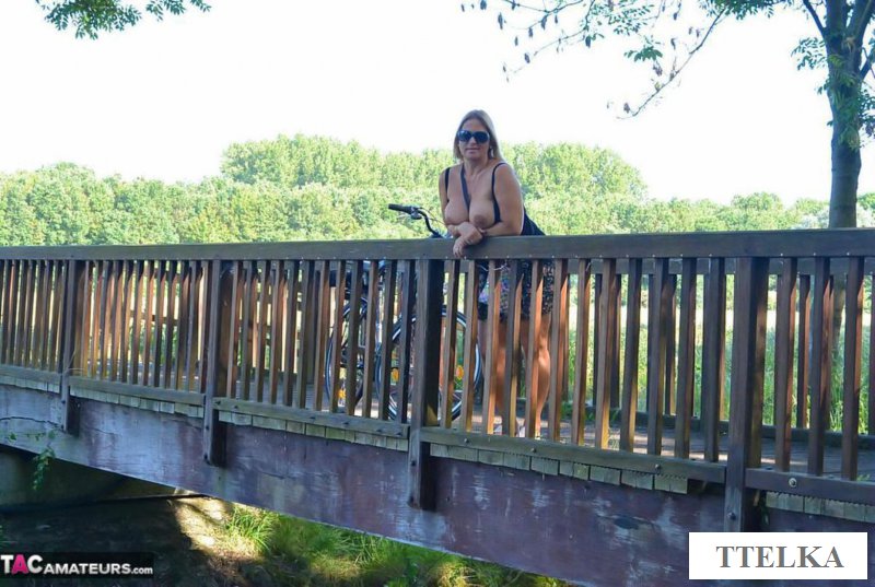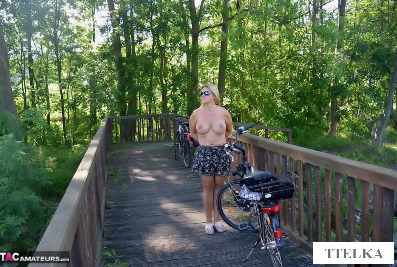 Обнаженная старушка с шикарными натуральными титьками решила немного заняться спортом и взяв свой дамский велосипед она направилась на покатушку. И теперь можно видеть, как пожилая женщина катается на двухколесном транспорте без трусов и этим самым она соблазняет мужчин. И когда она остановилась рядом возле одного парня, то сразу же подняла вверх свою маечку, а затем задрала юбку, чтобы еще больше возбудила всех.