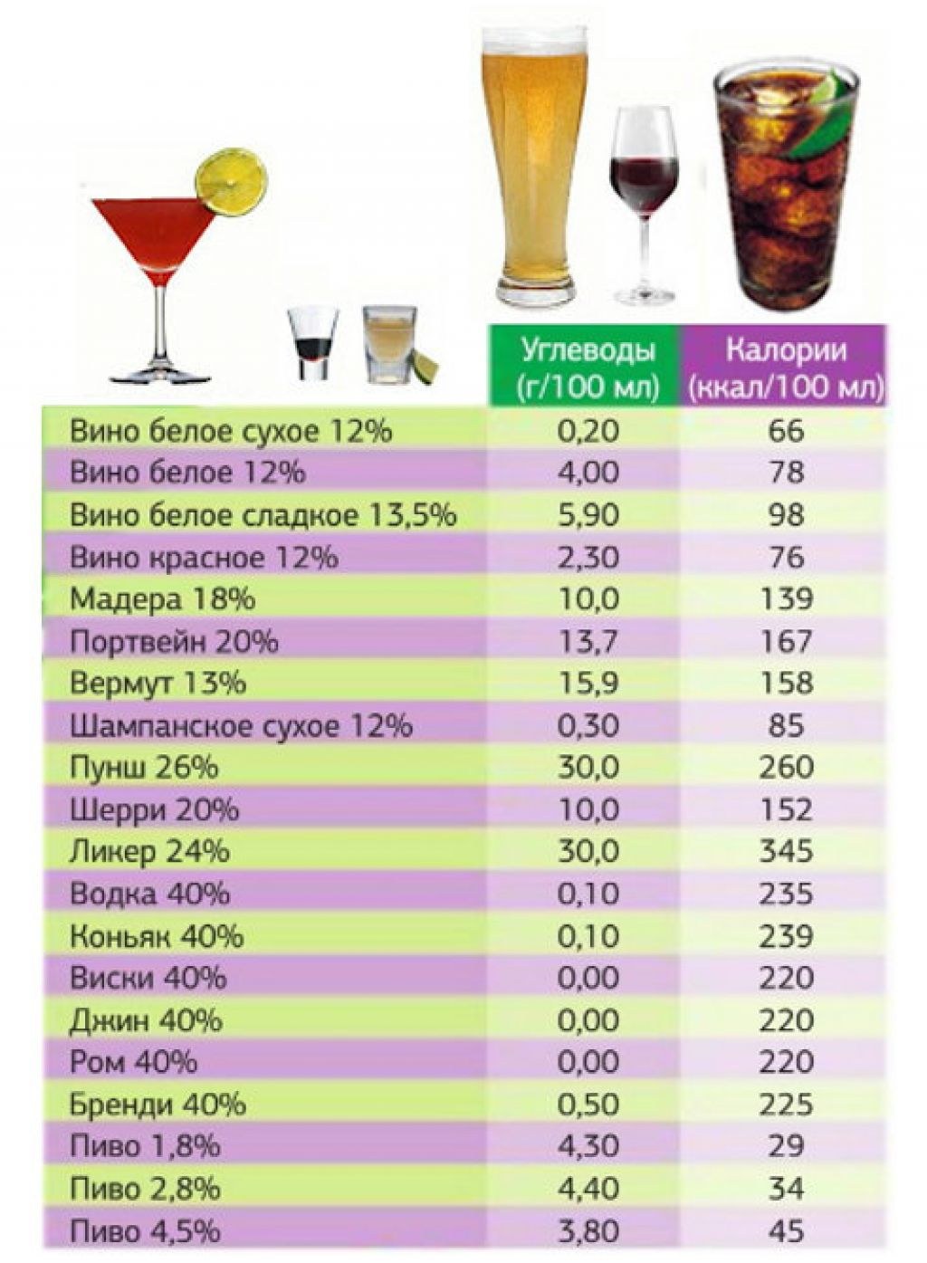 Contenido de calorías de la mesa de alcohol por 100