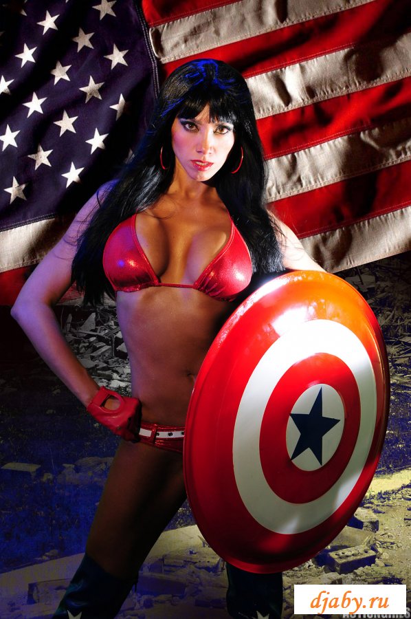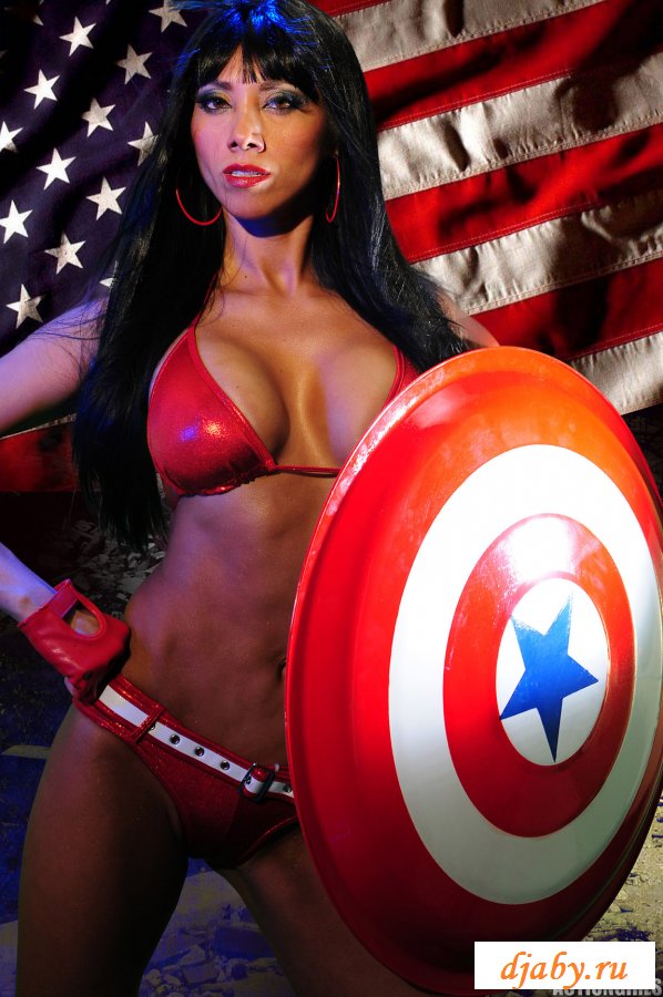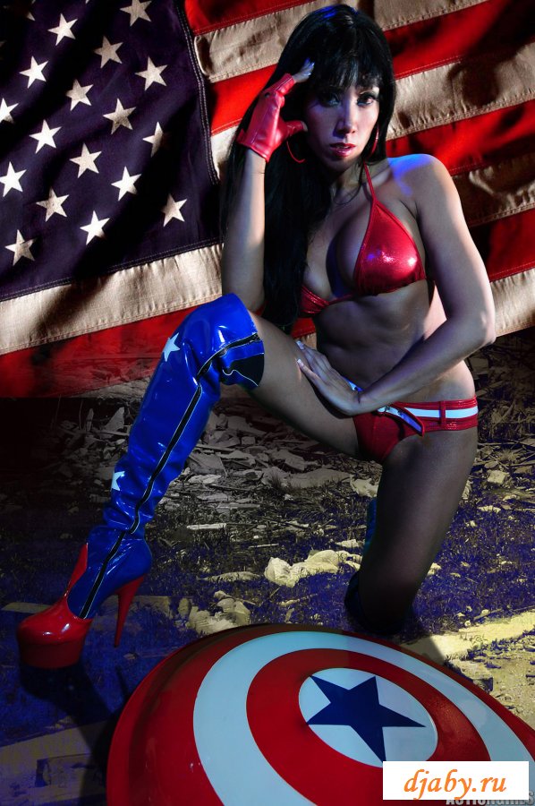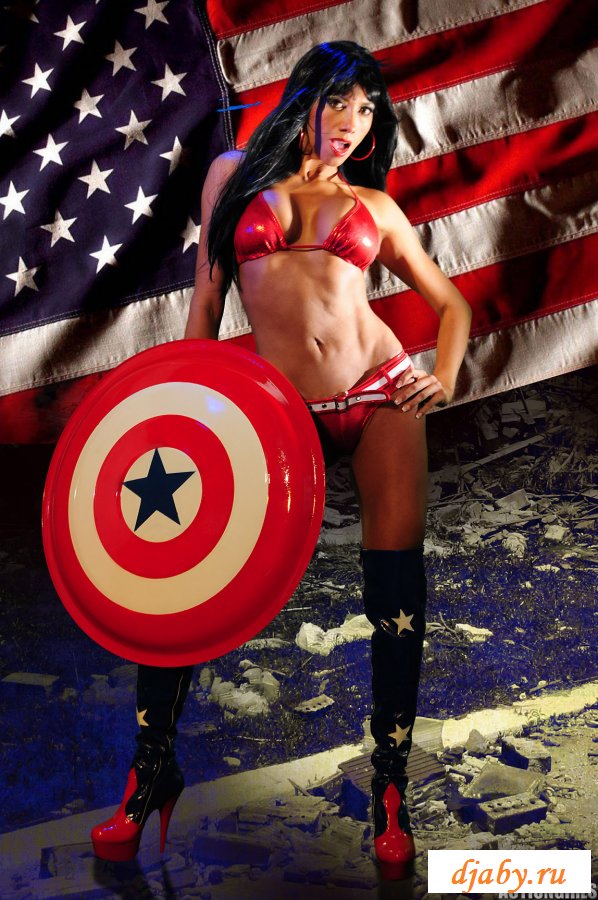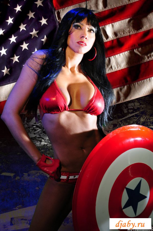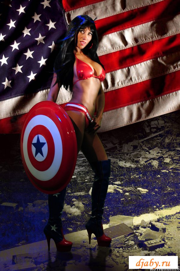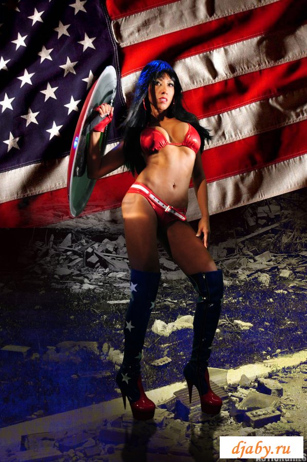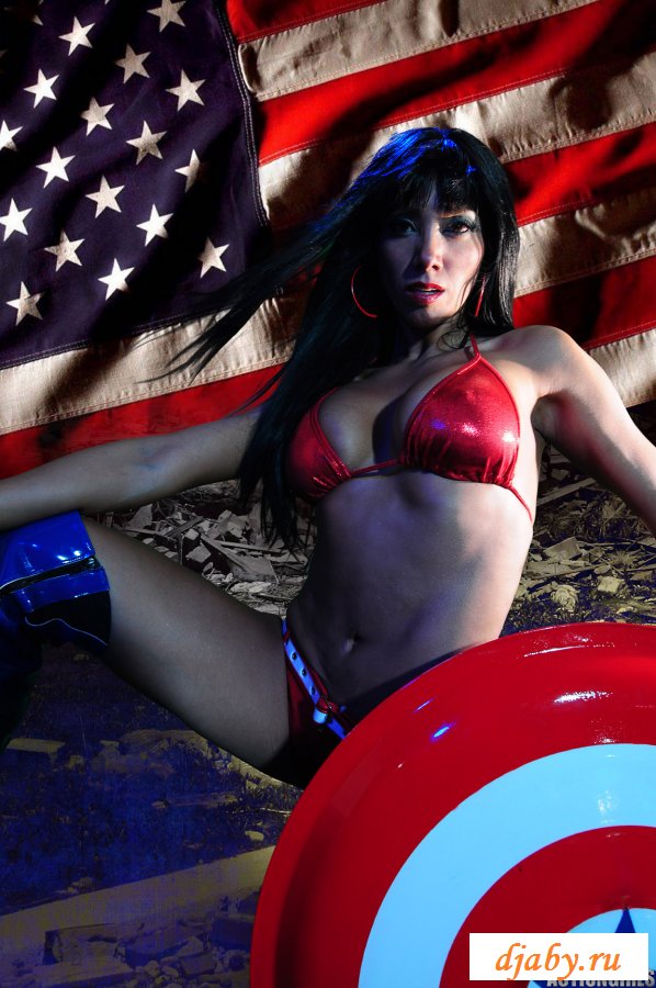 Девушка с большими сиськами позирует на фоне американского флага, она показывает свою пухлую задницу, шикарную грудь и тонкую талию. Из одежды на девушке только один лифчик и маленькие трусики, но ей такой прикид очень идет и телочка даже не собирается его менять.